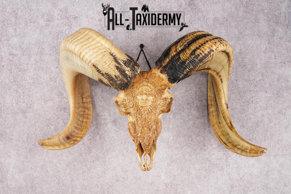 Outstanding carved sheep skull with a native theme, Chief, wolf, eagle, bear and owl carved.